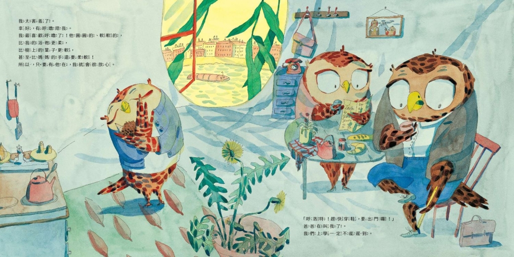 全書以水彩呈現,繽紛的色調加上樹影明暗的運用,呈現搖曳舒心的鬆動感,於封面處更藉此光影,聚焦在呼洛特身上;結合貓頭鷹大大的眼睛特質,讀者很自然的與之對望,不曉得從這雙大眼睛及牠的表情、肢體,您讀到了什麼?