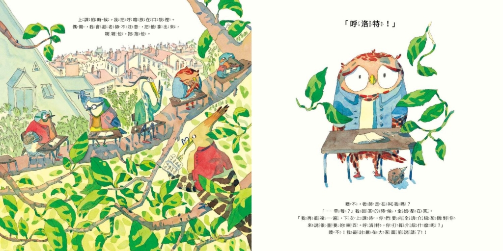 柔軟的呼嚕是牠的好朋友,每當擁抱著就能覺得安心;開學時間到了,呼洛特當然一定要帶呼嚕去上學。經過大街,高大的人群,在角落的呼洛特顯得是如此不安;而在樹枝課堂上的呼洛特被老師指名時,畫面正中央的牠,頓時成為所有目光的焦點(就連我們也正看著牠!)作繪者透過構圖的變化將呼洛特的境況與心情表露無遺。