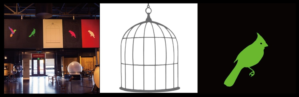 走著走著抬起頭,就看見幾隻顏色不一的鳥兒在黑與紅的底色中,特別顯眼,與中間以白色為底的籠子組合起來(如上方左圖),是什麼意思呢?這是名為「籠中鳥」的裝置,觀眾的任務,就是要想辦法將鳥兒關進籠子裡,要怎麼樣才能做到?