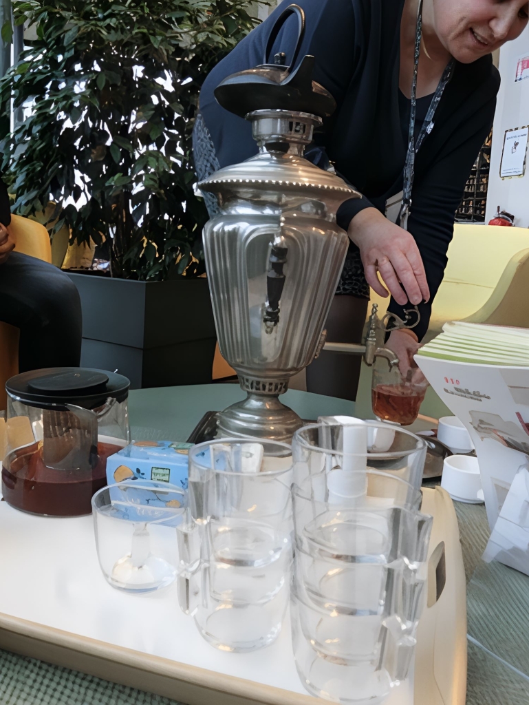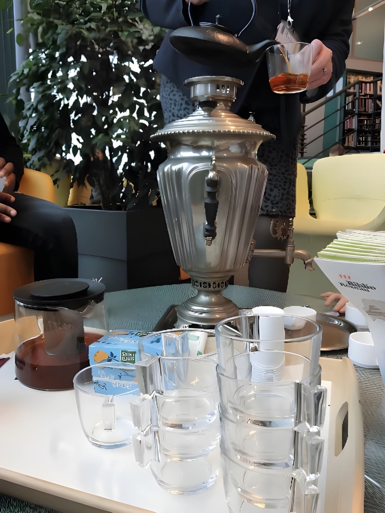 其中一次介紹的是俄羅斯飲茶文化,使用茶炊煮水泡茶。茶炊,結構有點像小時候吃的火鍋,中心放燃料,四周是液體,上沿利用蒸氣溫熱壺具,下頭有水龍頭承接熱水沖調濃茶,自行決定加幾顆糖。請看影片: