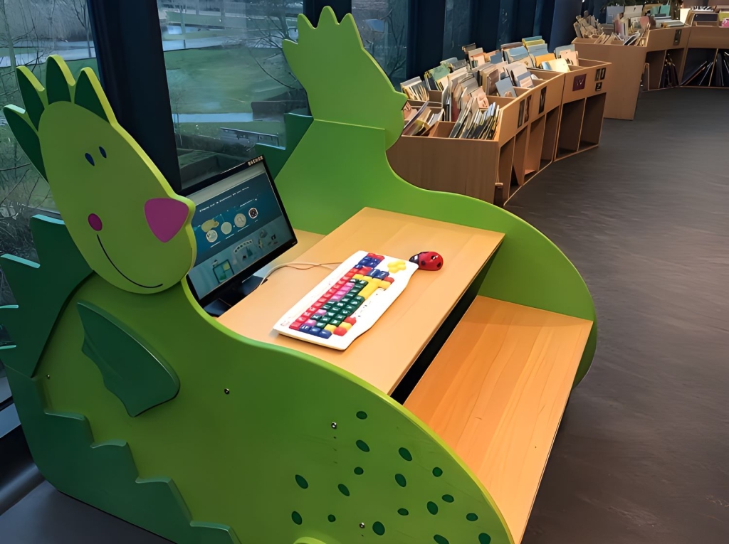 繪本是以首字母分類擺放,書箱標示的字母是用骨牌拼合形成的圖案來設計的,想起館方開幕時,曾挑戰「多米諾骨牌」,5684本書排排站,然後倒下⋯⋯可惜有的關卡沒成功,挑戰失敗。但點開影片看看巧思,也順便遊覽一下圖書館。