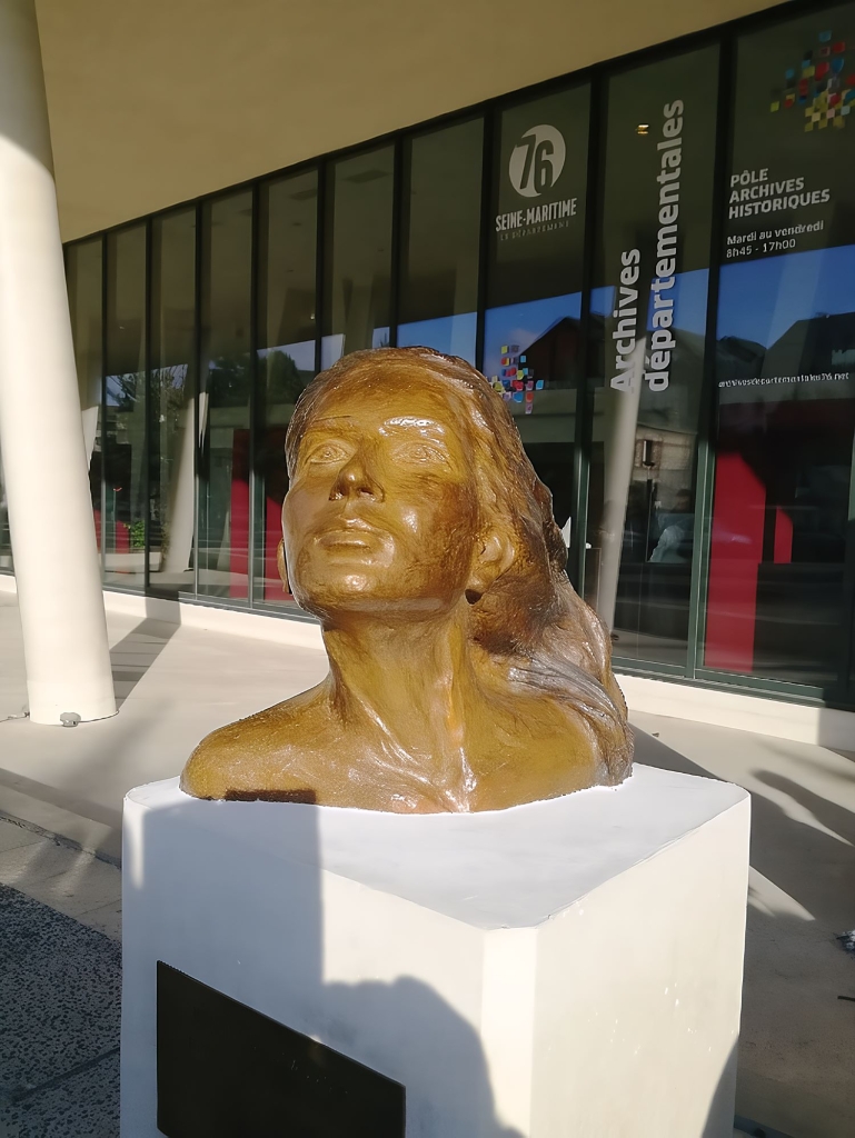 圖書館名為「西蒙(德)波娃」(Simone de Beauvoir),正是那本思考女性議題的《第二性》一書作者,她曾於1932年至1936年期間在Rouen當地一所中學教授哲學。正門入口處展著一尊她的半身頭像,是由兩所中學生協力創作。