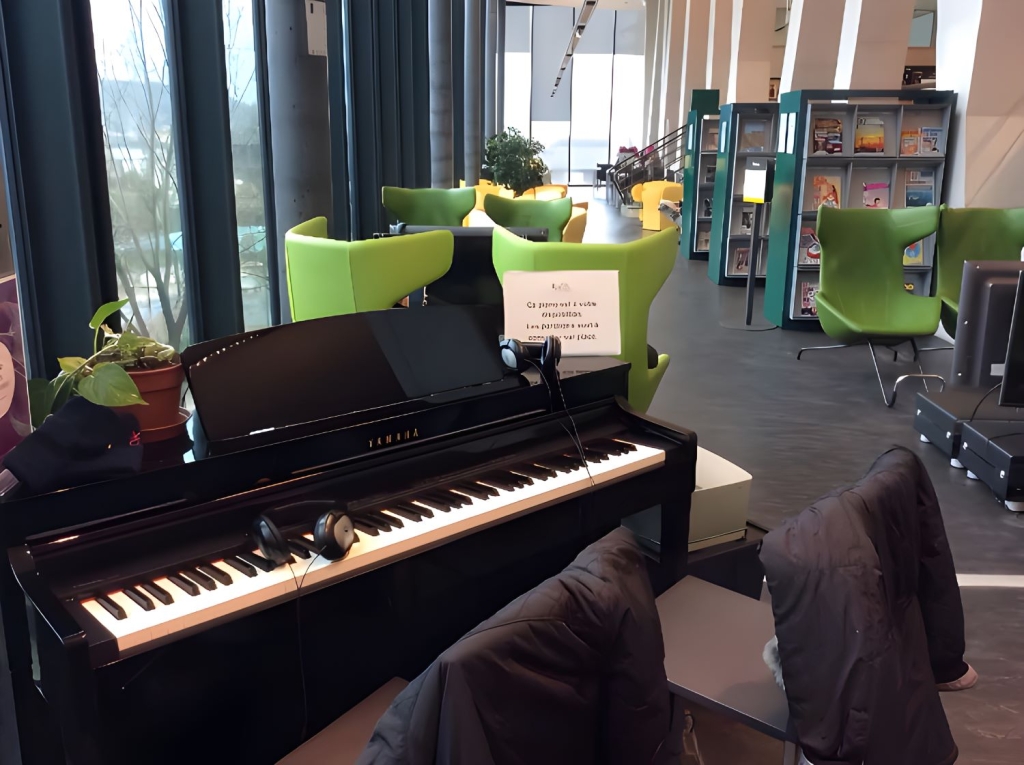 供讀者自由彈奏的鋼琴,大扇落地窗下一排排閱覽桌椅,還以為來到高檔餐廳了呢!光線雕飾著景觀,視覺上一大饗宴!
