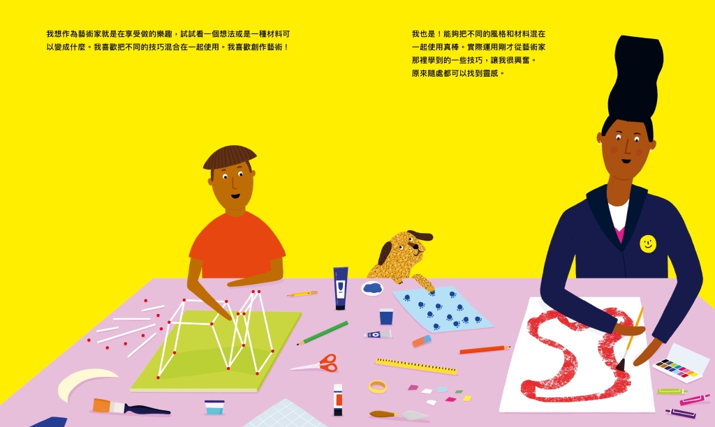 《我是藝術家》不僅僅是孩子們的讀物,也適合親子家庭共讀共學。家長們可以和孩子一起動腦構思、動手創作,在互動過程中為親子關係加溫,同時還能與孩子一同打造出獨一無二的藝術作品,讓孩子了解創作的無限可能,不只激發成就感,還能培養他們的表達能力。
