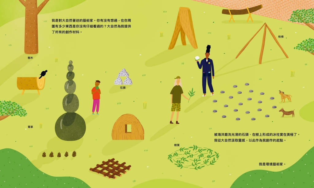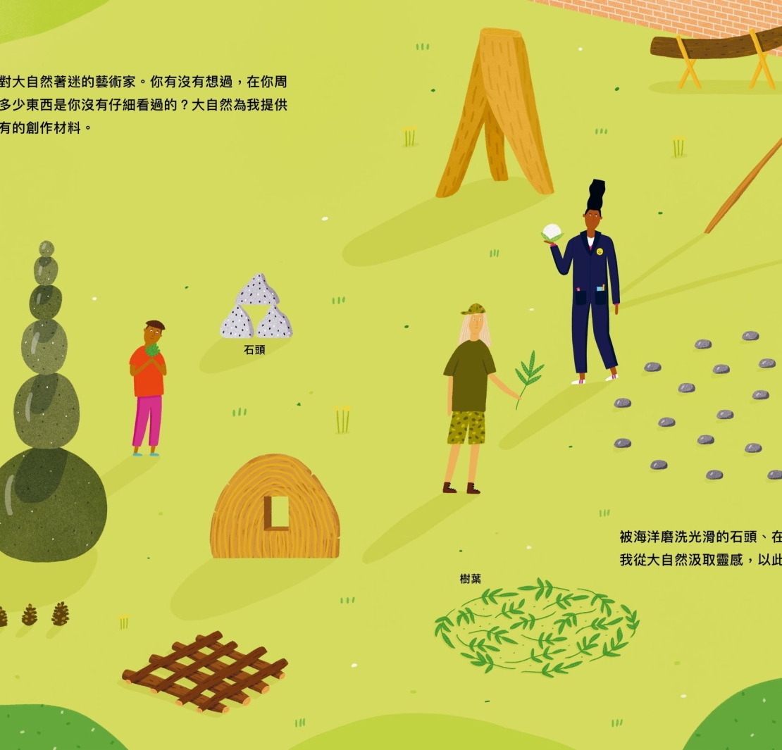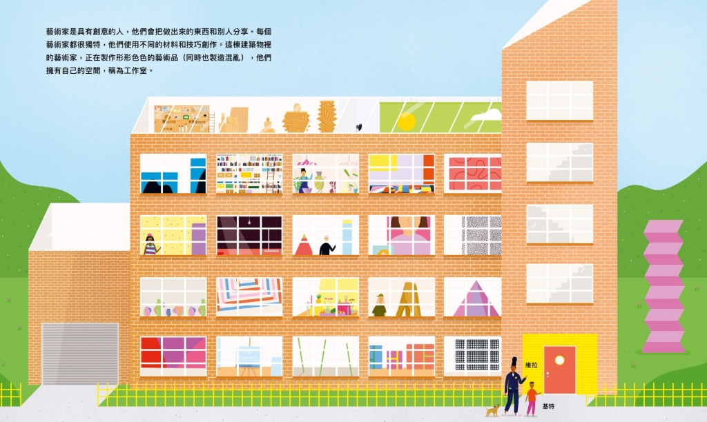 我們將跟著書中的人物維拉和基特親自走訪各式各樣藝術家的工作室,去發現原來創作靈感可以來自生活中的任何地方。書中的藝術家們透過不同的方式,把對生活的觀察和感受轉變成形形色色的藝術品,例如,拼布藝術家把一塊塊舊衣服縫合在一起,創作出富有情感的作品;環境藝術家將大自然中的樹葉、石頭等素材結合在一起,打造出充滿生命力的藝術結晶。不只如此,還有肖像畫家、陶藝家以及社會行動藝術家等其他好多不同的藝術家,每個人的作品和創作過程都不一樣,但都充滿了創意與驚喜!