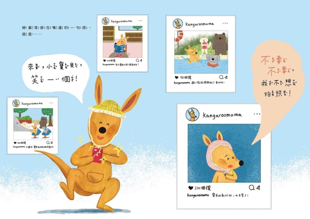 袋鼠媽媽喜歡拍照也喜歡分享,貼文總是受到歡迎,是彩虹鎮上的網紅大明星。其中最喜歡分享的就是孩子的成長點滴,不論是學校生活、餐廳用餐或是才藝學習,袋鼠媽媽都想紀錄起來,甚至分享影片讓大家看到小袋鼠可愛的模樣。