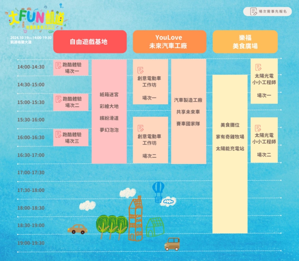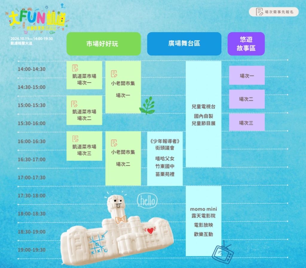 - 現場活動:紙箱迷宮、彩繪大地、繽紛滑道、夢幻泡泡、汽車製造工廠、共享未來車、賽車國家隊、秘密基地、家有奇雞牧場、momo mini露天電影院、兒童電視台、悠遊故事區、《少年報導者》街頭議會