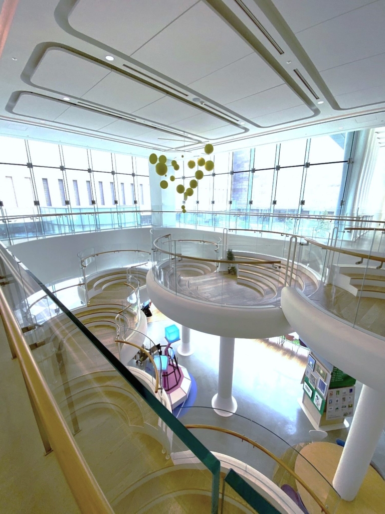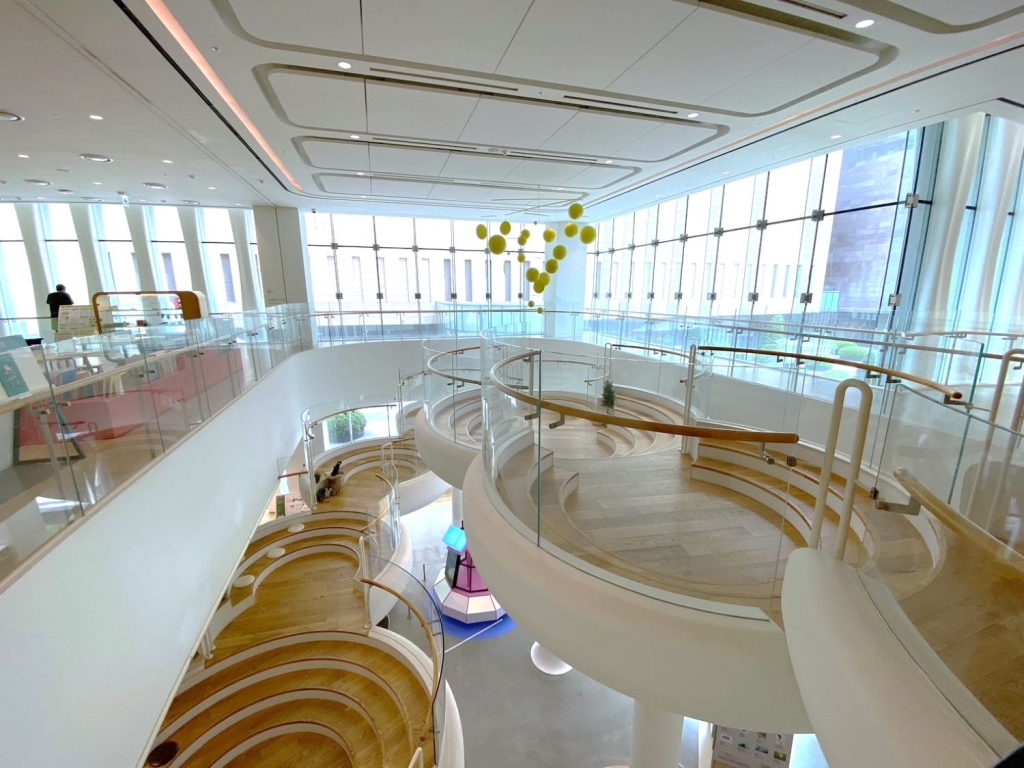 MOKA 不僅擁有豐富多樣的展覽,其內部的空間設計也極具吸引力。位於第一層中央的挑高區域,有一座宛如酒杯又似泡泡般的樓梯,踏上樓梯便能一覽戶外的空中花園。當光線恰到好處時,拍攝的照片更是夢幻迷人,這也是 MOKA 的一大亮點。