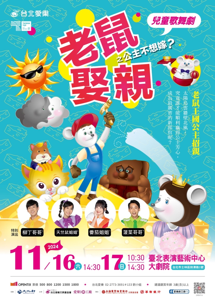 2024年末將至,愛樂劇工廠壓軸好戲不間斷,好評原創兒童歌舞劇《老鼠娶親之公主不想嫁》睽違4年將在11月16-17日於臺北表演藝術中心大劇院精彩上演!本劇第三度邀請兒童界人氣偶像柳丁哥哥(甘子禾),擔綱劇中男主角─小凱,除此之外首度加入幼幼台家族的活力陣容:天竺鼠姐姐(張恆安)、菠菜哥哥(羅丘旭)、番茄姐姐(鍾艾琳),四位哥哥姐姐齊「鼠」歡唱,帶來能量滿滿的歌舞劇作。即日起至10月底歡慶國慶購票享75折優惠,演出詳情請上OPENTIX售票系統或台北愛樂官方網站!