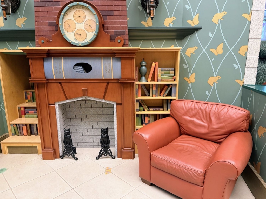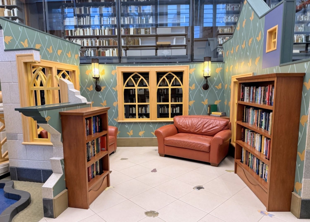 一進入圖書館,映入眼簾的是一本超大的紫色精裝書,上面印著圖書館的名字,接下來的花園場景有修剪成不同動物的樹叢,令人想起 Chris Van Allsburg的圖畫書《The Garden of Abdul Gasazi》的插畫。再往前走會看到有壁爐的客廳,有舒適的沙發和書架,架上的童書可以在這個空間裡閱讀,但不能外借。