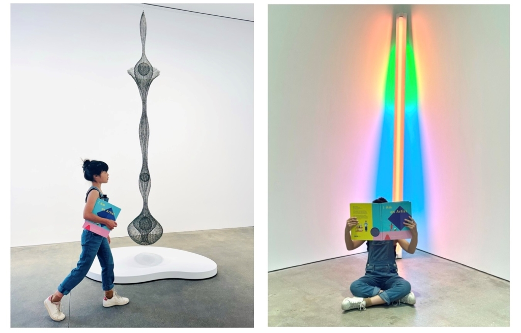 我發現光開頭那段話,再搭配書中內容,就能與孩子在展覽裡進行一番探討。我和孩子在讀完《我是藝術家:走進藝術家的工作室》後,帶著書一起去了卓納藝廊的30周年特展。由於卓納貴為世界藝廊翹楚,展出了許多一流大咖,展品也非常多樣化,我和孩子這回則把看展重點放在藝術家作品的不一樣上。