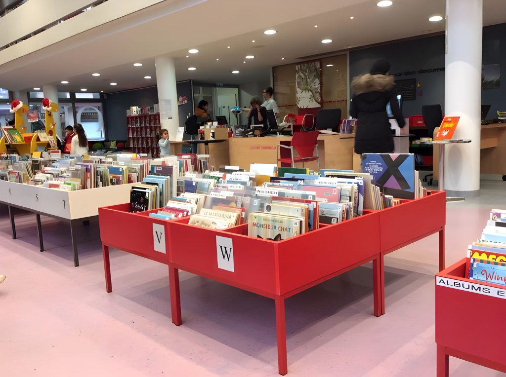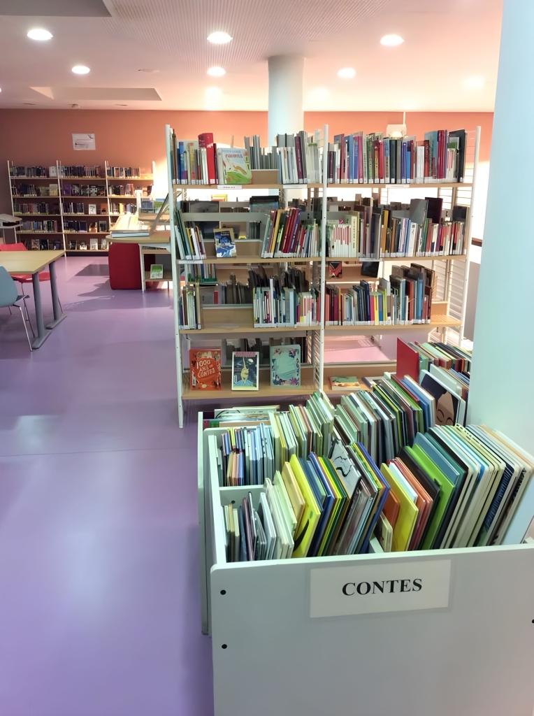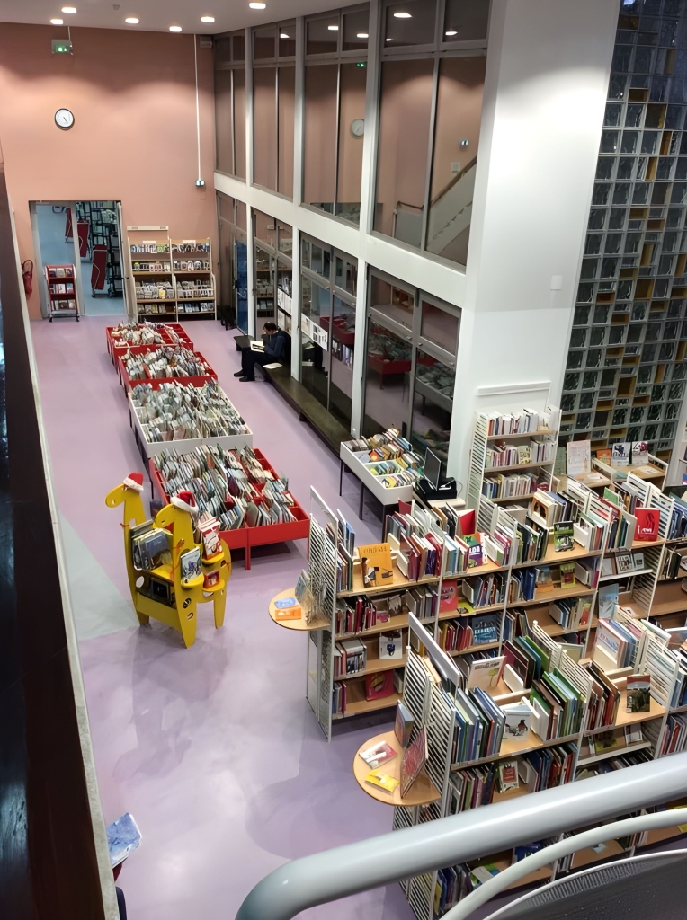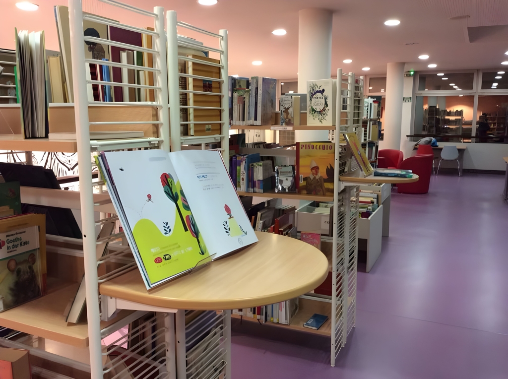 館舍右側是兒童館藏,入口旁放了幼兒讀物與新登錄的圖書。五歲以上繪本區,有一隻搶眼的長頸鹿書架,讓裝飾不多的兒童圖書室整個活潑起來。
