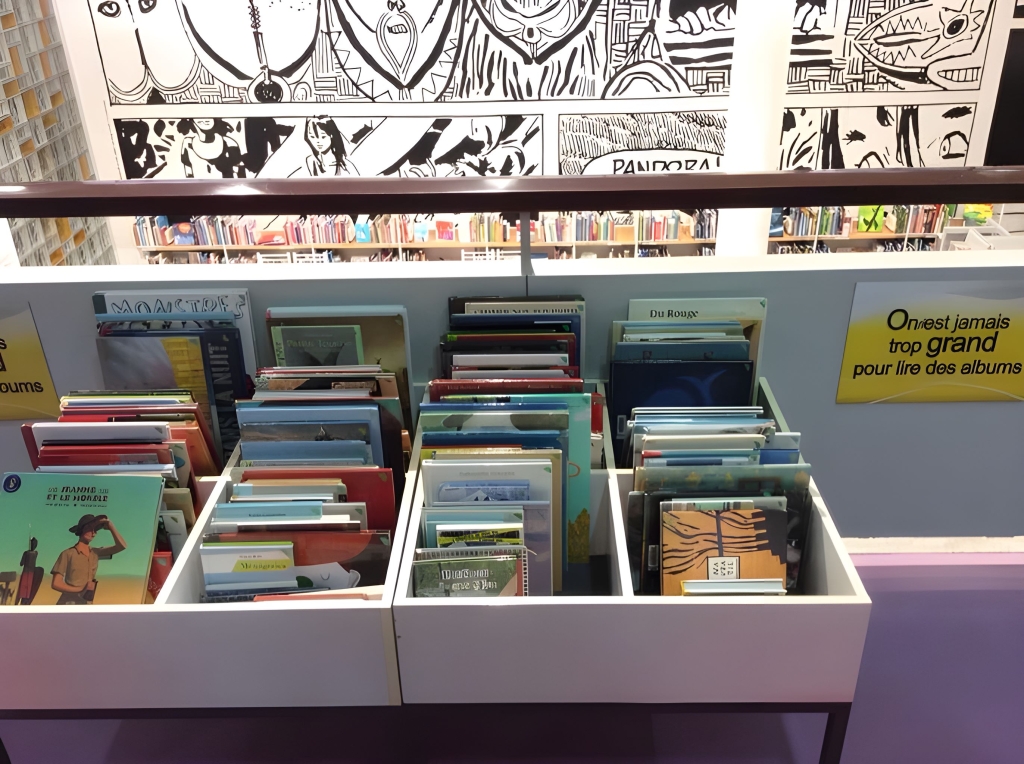 二樓牆上貼著「讀繪本永不嫌老」(On est jamais trop grand pour lire des albums.)的標語,像在為我大聲宣告:身軀佝僂、銀髮、老花的我只要開館一下課便會準時報到,一本一本的享受著,喔呵呵~我是快樂老人!