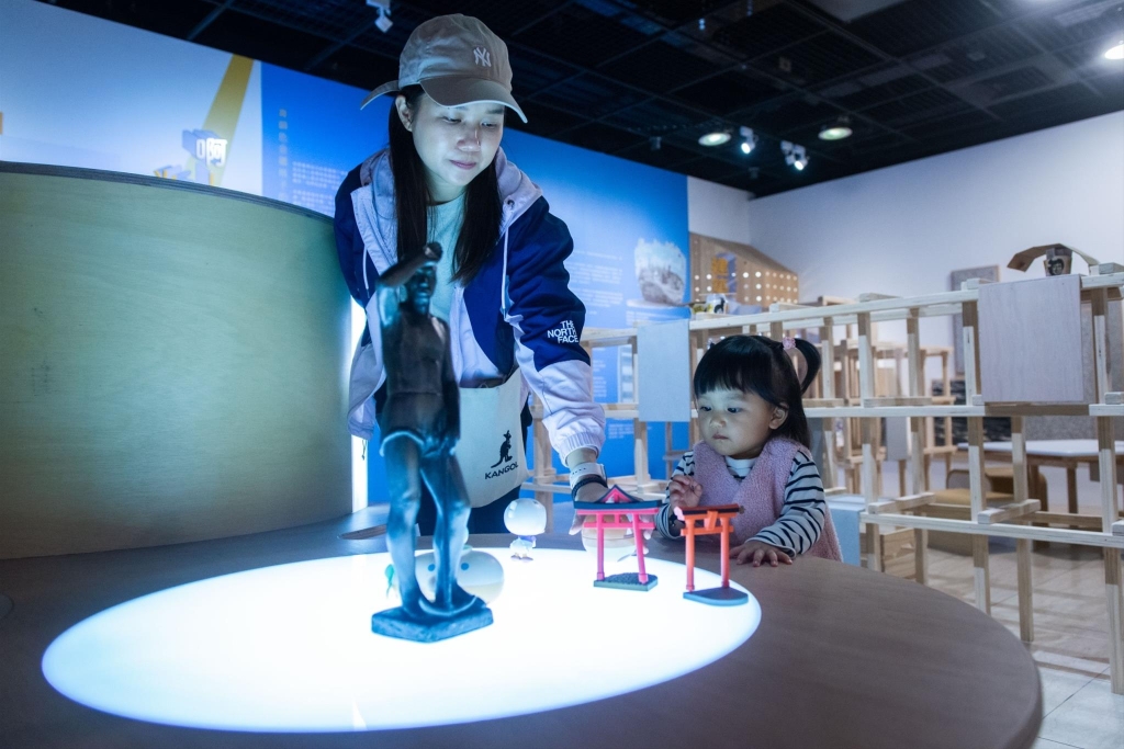 不同材料的應用創造出截然不同的視覺效果,也影響人們對建築的第一印象。來到〈建築的皮膚〉一區,展場呈現了石材、金屬、磚材、木絲水泥板、馬賽克等等多元的建材,鼓勵小朋友可以親手觸摸這些材質,感受它們的溫度與紋理。