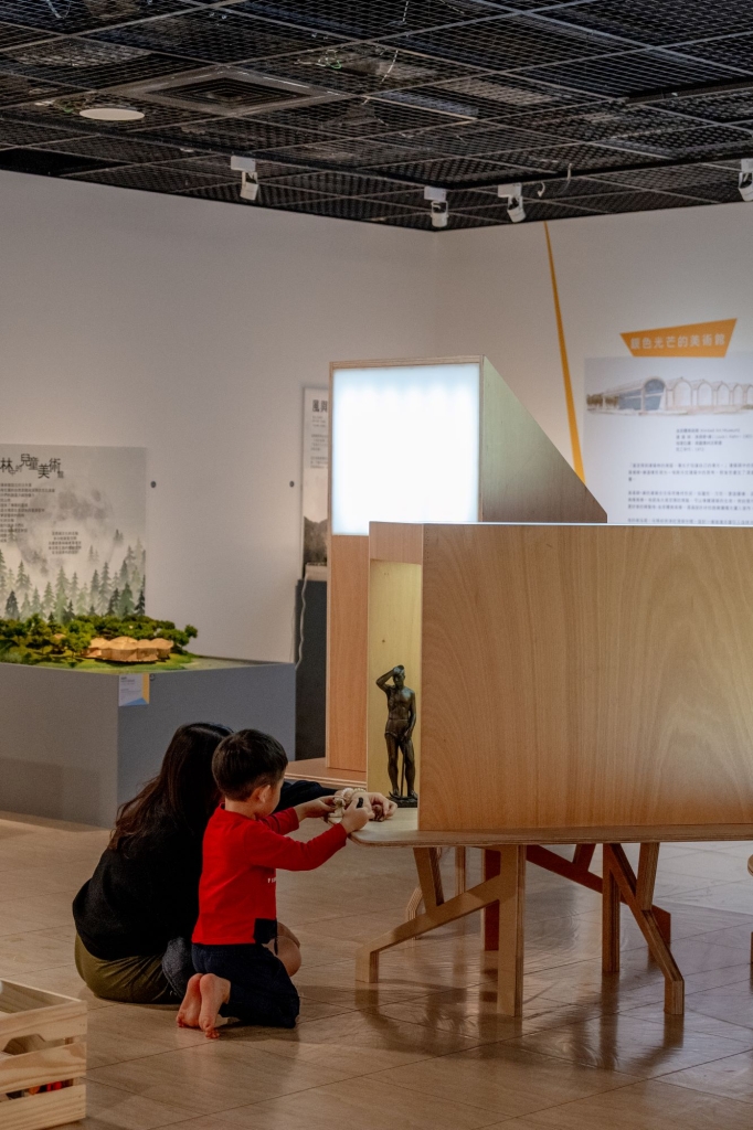 而在〈如果,我是美術館建築師〉展區裡,則匯集了創作者們的奇思妙想。實踐大學建築設計學系副教授蕭有志在他所創作的「一個人的美術館」中,巧妙藏有藝術家吳修銘的「躲貓貓」聲音裝置,創造出獨特的感官體驗。