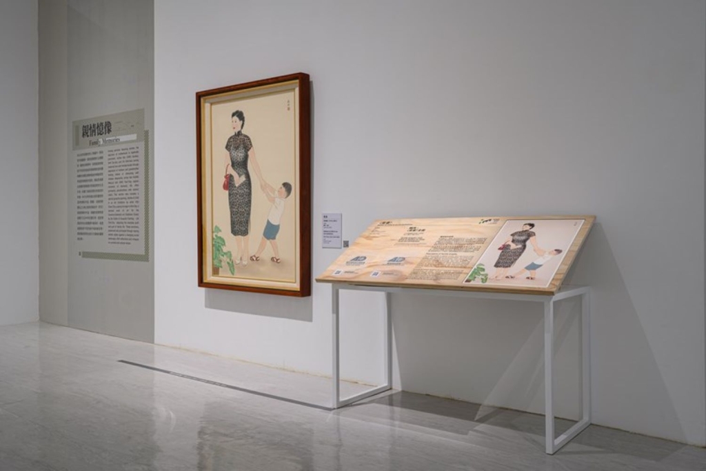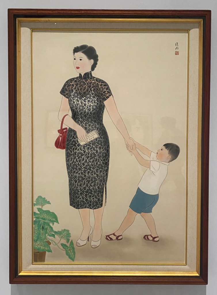 這幅作品是許深州於1955年創作的膠彩畫〈賞畫〉,可以看到畫中描繪了一位穿著漂亮旗袍的媽媽和一個調皮可愛的小男孩,兩人之間的互動,不知道是否會讓你聯想到親子間常見的拉鋸場景呢?不過這幅畫中的氛圍看起來是溫馨的吧~