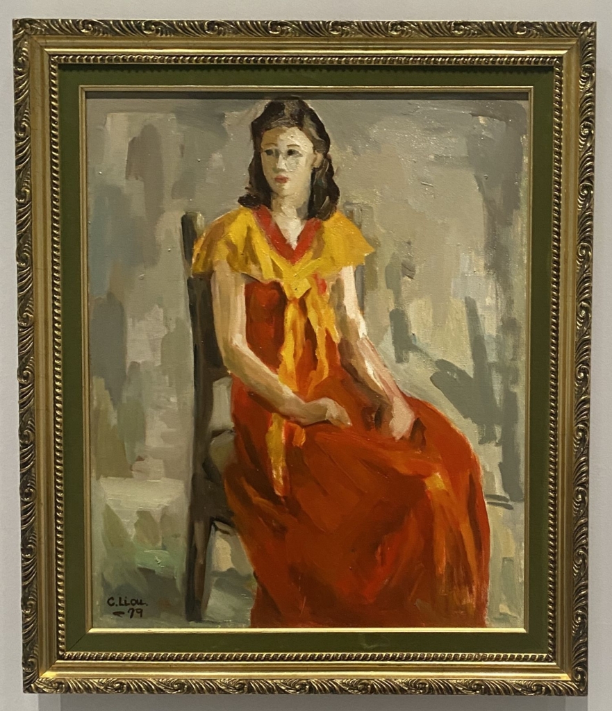 這幅作品是劉啟祥於1979年創作的油畫〈紅衣女郎〉,畫作中的女子除了穿著無袖的紅色長洋裝外,還披著黃色披肩,看起來就像陽光下的紅花一樣耀眼,吸引我們的目光!背景色則運用灰色、黃色、藍色和綠色相調和,讓女郎的紅裙更加顯眼,這樣的搭配就像舞台上的燈光一樣,把人物襯托得特別出色。你可以試著找找畫中的光線來源~仔細觀察人物的臉、脖子與手臂,看看膚色的明暗變化,就可以發現光線是從畫面的右上方照射出來。