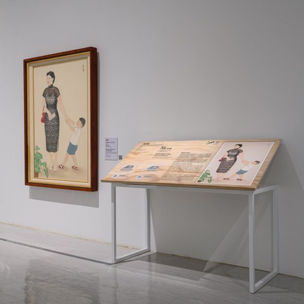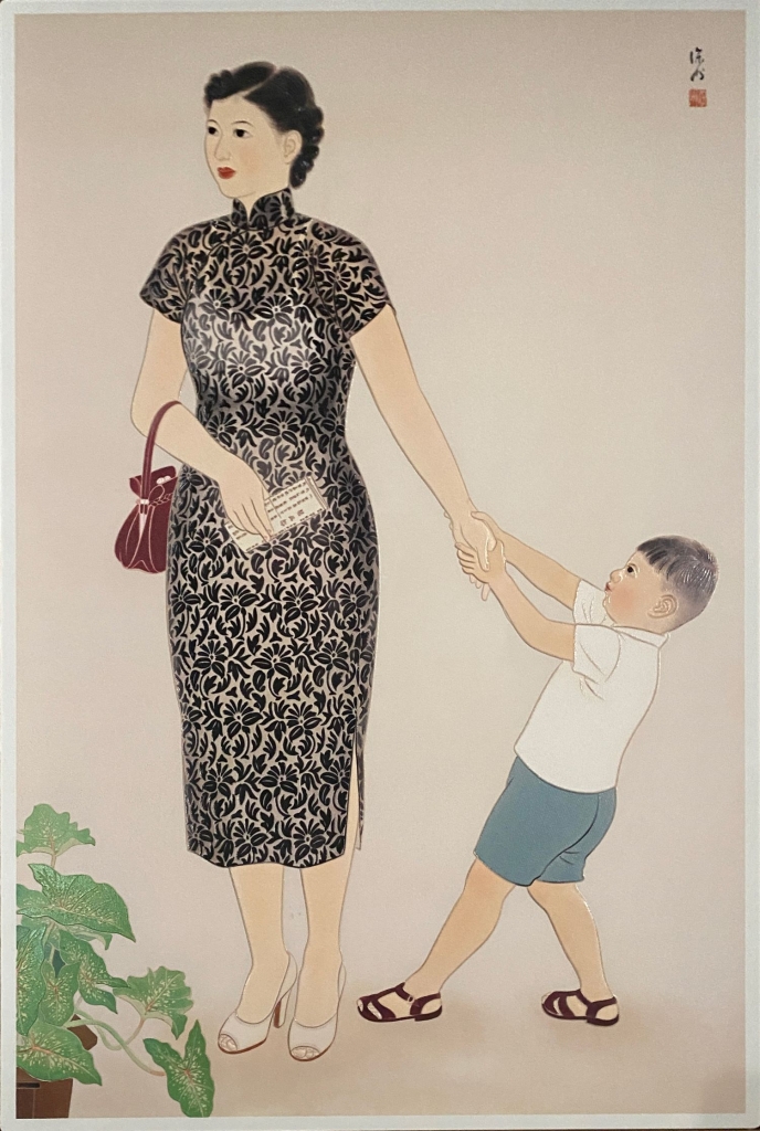 年輕的媽媽看起來時尚、貴氣,她有著俏麗的短捲髮,身材豐腴有致,穿著黑色絲絨花紋的合身旗袍,搭配白色的魚口高跟鞋、酒紅色的手提包,右手拿著像是畫展介紹的摺頁,可能正在欣賞畫作,左手則被小男孩兩手拉著,孩子看起來似乎想把媽媽拉去哪兒玩。小男孩穿著白色上衣、藍色短褲和涼鞋,你可以仔細觀察他的姿態與表情,你覺得兩眼盯著媽媽、嘟著嘴的小男孩會說些什麼呢?而目光、身體都向前的媽媽又會說些什麼呢?