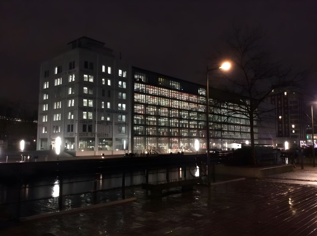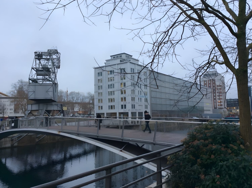 尚未走進圖書館,遠遠的便看見河岸上站著兩具「機甲怪獸」,伸長臂膀像有工程持續進行似的,查詢資料才知:那是為保留工業時代原有的统一感而刻意設計的。造訪當日,天氣陰霾,整體透露一股工業頹廢風格,像動畫片《瓦力》那般肅殺。然而鐵支架搭配木條版的弧線橋樑,將垂直剛硬的長方體建築柔和許多。