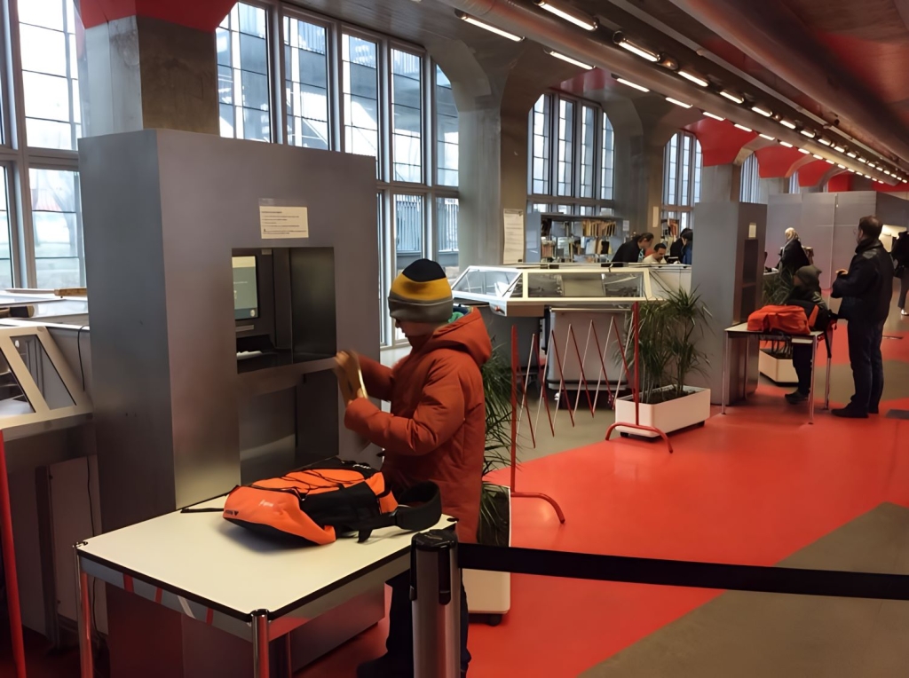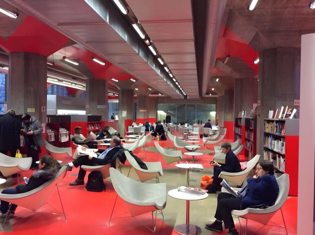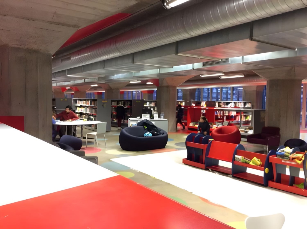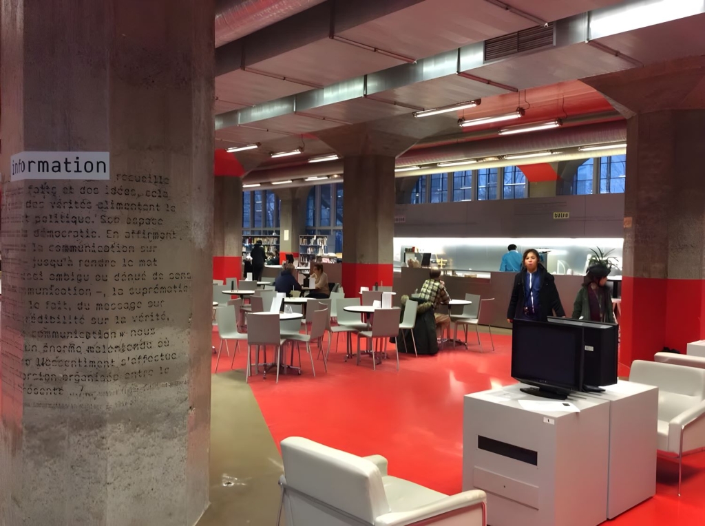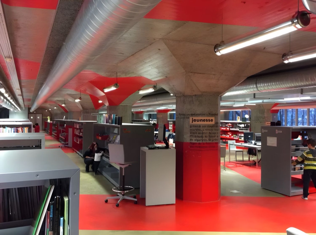 走進館內,迎面而來的是大紅色,從地板到書架三分之二處盡被鮮豔赤紅包覆,讓灰色水泥有了溫度。大廳一側展示亞爾薩斯區在地作家作品,是柔軟的人味;另一側則是自動還書機,是剛硬的機械,都跟紅與灰兩種主色調應和。