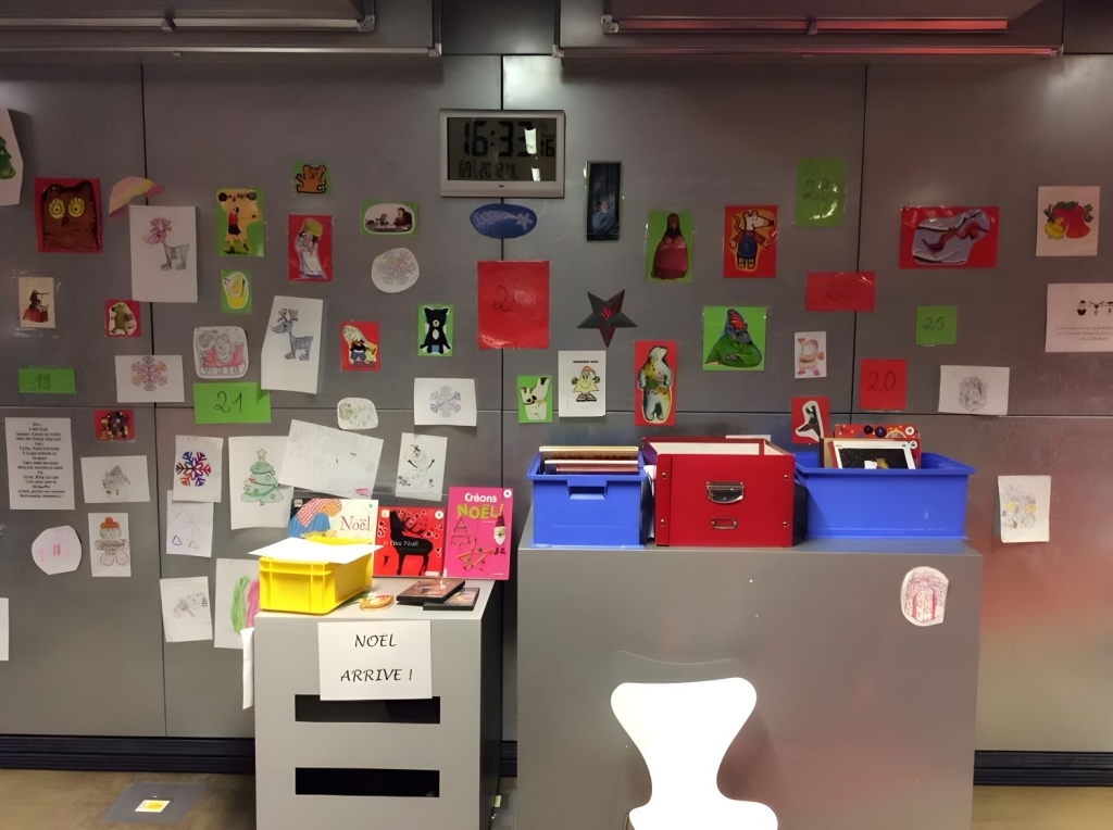 二樓則是童書館藏,樓梯間的小小牆面,隨著聖誕節倒數,貼著小讀者們的自由聯想畫。轉角走向藏書區,哇!紅色地面如同紅毯,在天花板長長的銀色通風管一路引領下,陳列一排又一排的繪本。像來到吃到飽餐廳,滿層美食佳餚,一時不知該從哪道餐點劃下刀叉。