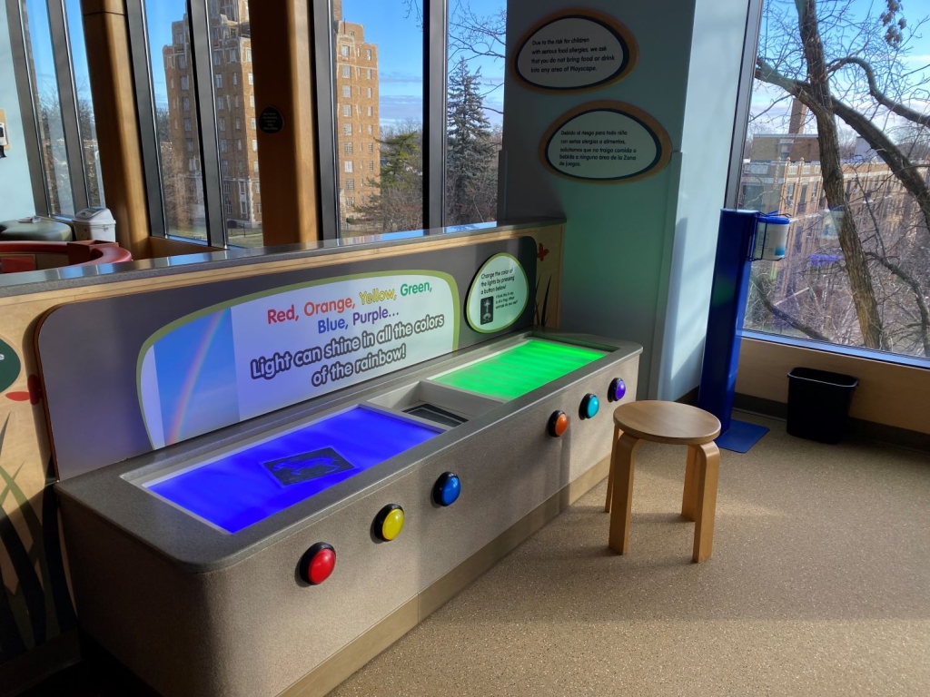 Playscape於2013年整建,是館內唯一有落地窗的空間,也是Elyse深度參與的產出之一。在這個空間裡,孩子不僅能欣賞窗外四季的變化,也有大量的感官體驗(例如:觸摸沙子、感受水流、體驗樂器、聽取各種環靜音);空間裡總是有4至5位的館員,視孩子與陪伴者的狀況提供各種好玩的點子;另外提供定時的手作與音樂等創造課程,提供孩子與陪伴者各種表達與互動的機會。