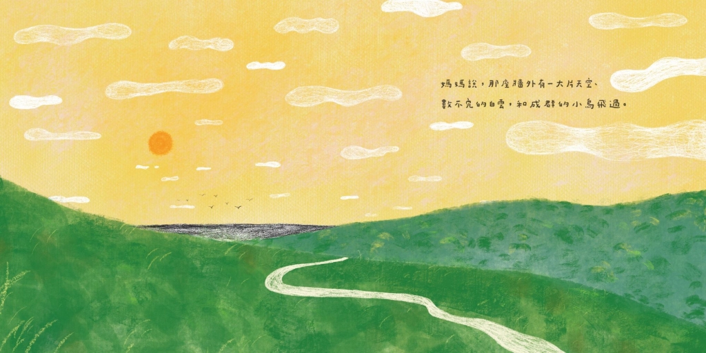 媽媽說:牆外有一大片天空,數不完的白雲,和成群的小鳥飛過。