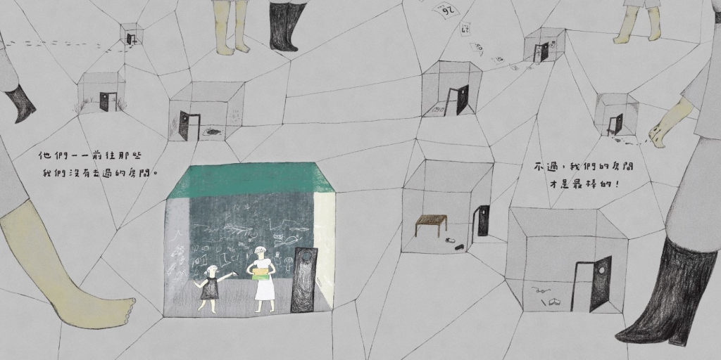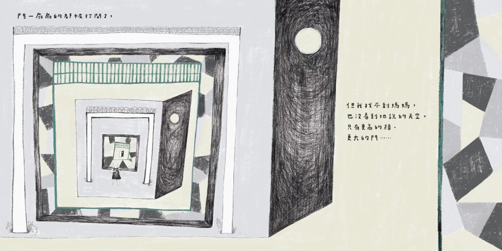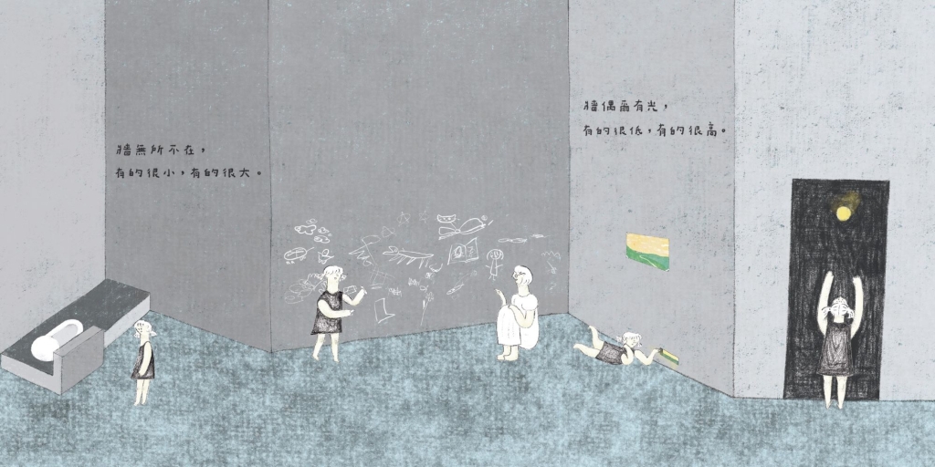 《牆外的牆》以小女孩的視角環視身邊一道道的牆,門外透進的光、偶爾傳來的腳步聲,還有和媽媽在一起的空間,這是小女孩的全世界,每翻一頁,我們就擁有更多的線索,試著去探索這是什麼樣的房間?也不禁去思考小女孩背後的故事。