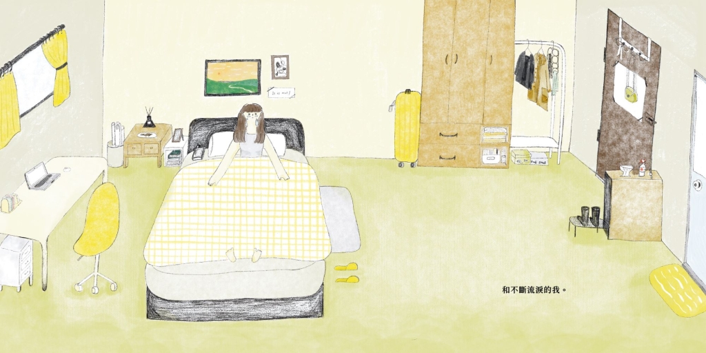 故事開頭是滿版的風景,綠色與暖黃色的搭配,帶來生機盎然的、溫暖人心的感受;整體視野遼闊,讓人感覺愜意與自由。翻頁後,風景猛然縮小成牆上的畫,色調瞬間變成陰冷的灰黑色,帶來心理上的衝擊──原來,這片風景只能是母女的想望。