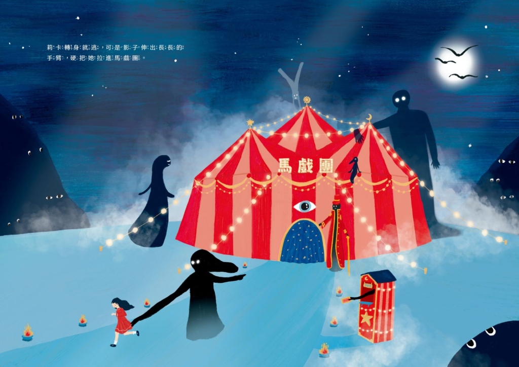 《影子馬戲團》以女孩和影子為題,當影子開始變得有點不受控制的時候,或許可以不理它、忽略它、假裝它很普通,女孩從剛開始覺得奇怪與不自然,漸漸覺得害怕,因為影子似乎愈來愈大、在黑暗中包圍著她,最後把帶到一個完全沒有任何形體的影之國,女孩逃不了也走不掉,無數的影子都好似在嘲笑她,感覺好孤單、很害怕…….