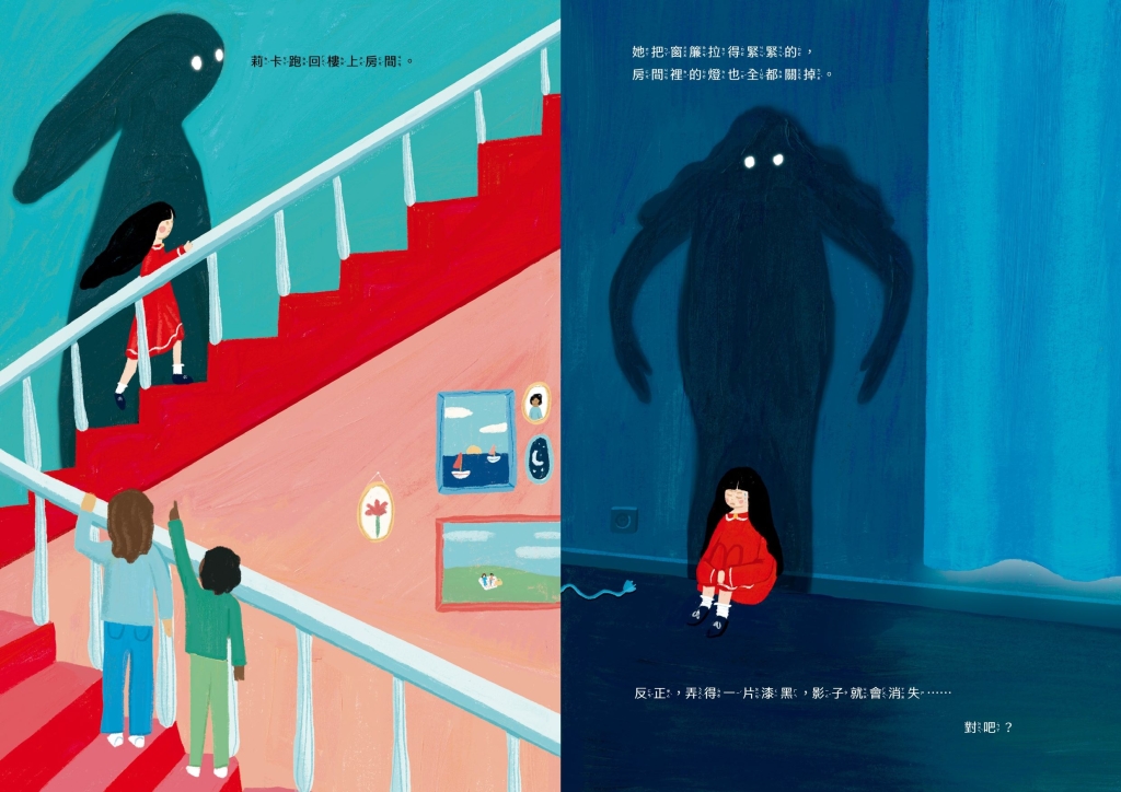 由於主題是影子,所以這本書有大量的光影來呈現心底那份抽象的負面。前後呼應的蝴蝶頁很可愛的帶出女孩和影子兩個(其實是一個?)角色。