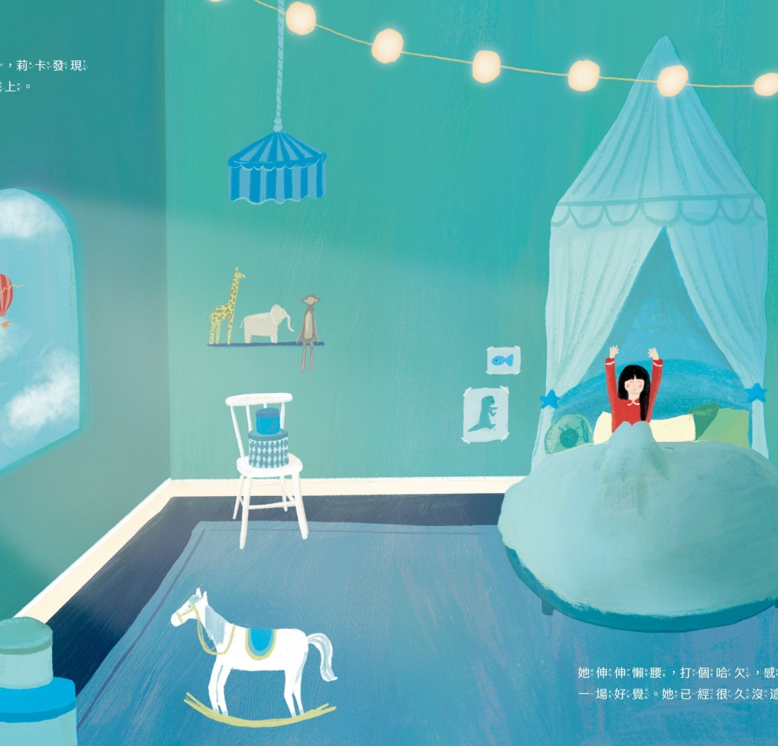 故事最後離開了黑暗,乘著熱氣球來到遼濶的藍天,女孩夢醒後,邀請讀者不妨也看看圖像有什麼繪本暗藏的小線索,是你覺得很熟悉的呢?!