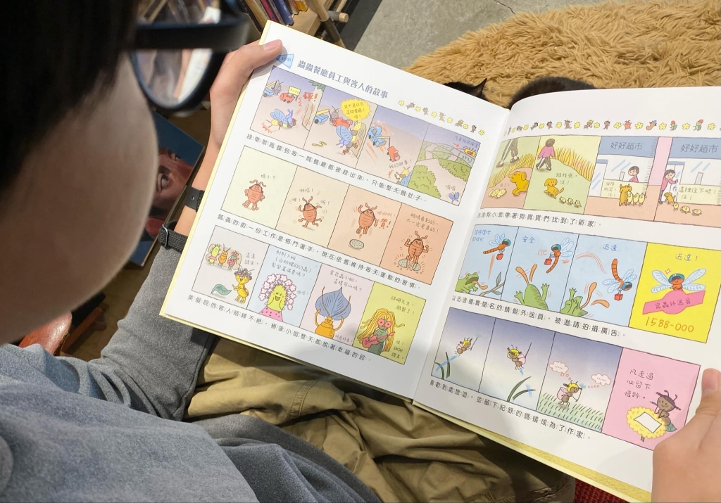 我很佩服最近讀到的《蟲蟲餐廳》裡料理點子超級多的主廚螳螂,他可以根據每種昆蟲顧客不同的需要,設計出適合他們的菜單,比如說給奔波辛苦的快遞司機獨角仙送上補充元氣的「蜂蜜滿滿草莓漢堡」,給工作累了會一直放屁的椿象小姐送上「放屁煩惱終結香腸」和「排便救星優格」,還有為照顧寶寶們很辛苦的狼蛛媽媽做了「比火車更長的麵」可以優雅的用長吸管吃,狼蛛寶寶們可以在遊戲區玩耍不打擾媽媽吃飯,這樣既美味又貼心的美食,讓我這個昆蟲迷愛吃鬼看了都要流口水了!