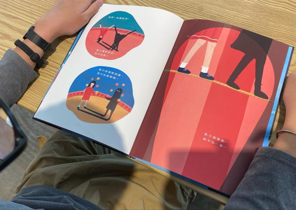 我想到了《影子馬戲團》裡不喜歡和影子玩的女孩莉卡,因為她的無視和躲避,影子變得越來越奇怪,奇怪到讓人覺得害怕,其實當你好好面對它,看清楚了影子的真面目,就會發現它也就是另一個自己,和自己玩一點都不會無聊或是寂寞,因為它是全世界最瞭解你的人了,從小因為沒有兄弟妹,很喜歡自己玩,我就覺得影子是我最棒的玩伴,它知道我腦中所有古怪的念頭,不論我到哪它都會跟隨,永遠不會離開我,我們在馬戲團裡一定是默契最佳的夥伴!