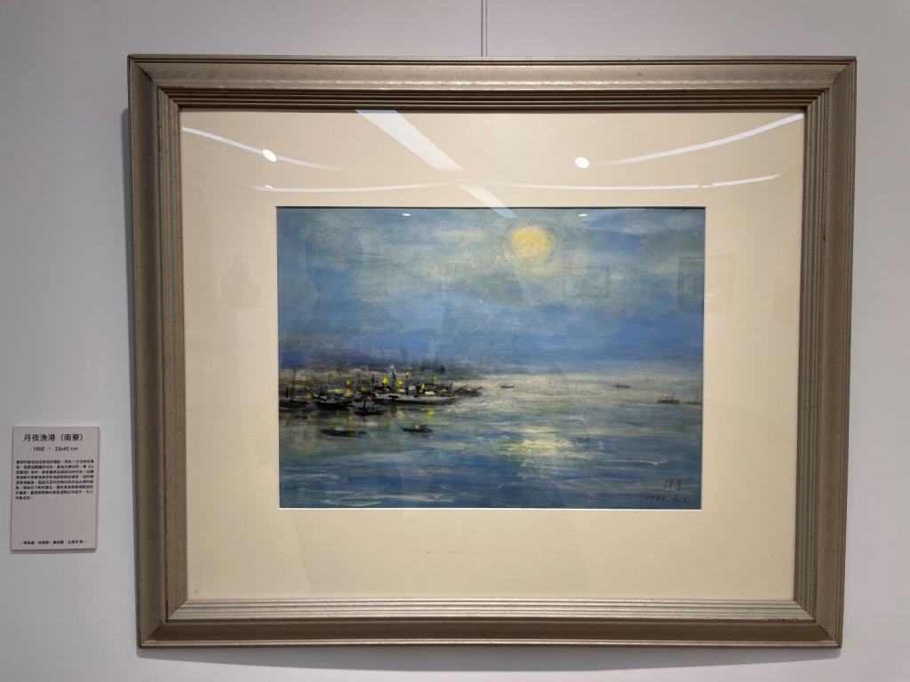 在展覽廳的西側,則是兩幅新竹西邊南寮漁港的景色,老派博粉家琳特別喜歡《月夜漁港(南寮)》這件作品,站在畫作前,彷彿沐浴在深夜的月光中,被寧靜美景包圍。
