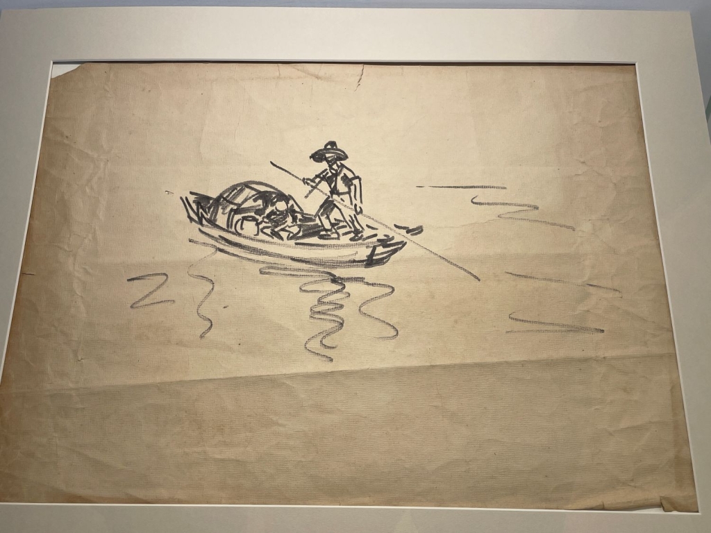 左側玻璃櫃中的〈擺渡人〉速寫,主角蹲在船上,兩隻手臂張開撐著長竿,彷彿用盡力氣在水中前行,但水面上只有稀疏寂寥的波紋,似乎暗喻著潭水高深莫測、以靜制動,也讓作品整體看起來既靈動又沉靜,散發獨特的韻味。