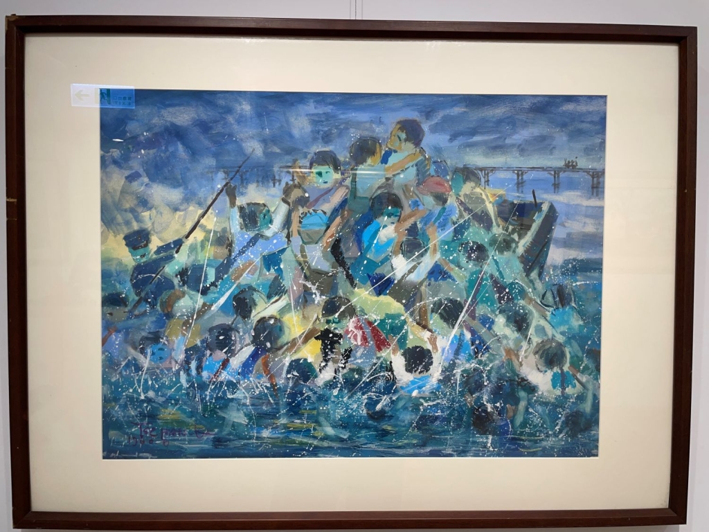 1960年3月22日,舊港里的一些孩子們在坐船渡頭前溪前往南寮國小的途中,因渡船超載不幸翻覆,整個社會都非常悲傷,李澤藩用明度較低的暈染色塊,描繪出渡船翻覆時孩子們的驚慌失措,再用明亮細碎的白色點與線,創造出彷彿是水花噴濺的效果,將畫面切割,增添張力與傷感。這幅〈斷我心腸〉,紀錄了新竹市曾經經歷的哀傷,當代的我們看見畫作時,也難免心碎。