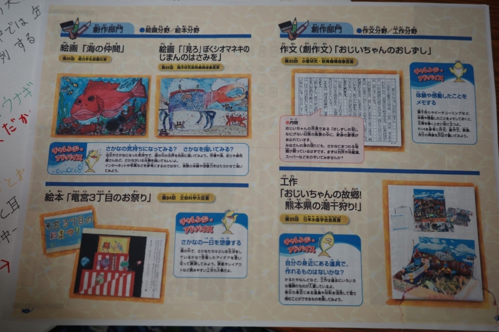 例如凜太朗喜歡魚,完成自由研究之後,就可以參加「海與魚」(「海とさかな」)自由研究・作品徵集比賽。它不是只有「比賽」那麼簡單,這項競賽,由「日本朝日新聞社」與「朝日學生新聞社」,我仔細參讀它的參與團體,可以說是聯繫了大部分本國相關的水產科學與教育部門這項競賽已經進行到四十三屆,我們看到的是全國在參與「海洋與魚類」相關知識、研究以及創作繪畫孩子們的作品招募,背後亦是成人社會,正進行相關工作的溝通。