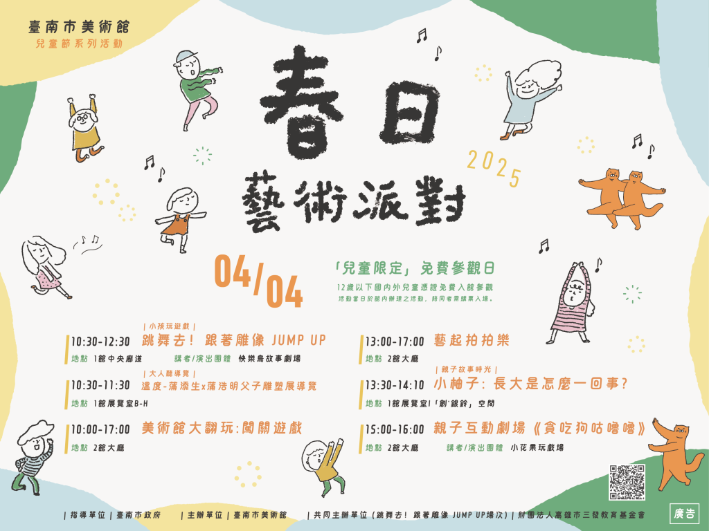 兒童節該怎麼過才特別? 臺南市美術館邀請大小朋友一同參加 「2025春日藝術派對」,當中包含肢體遊戲工作坊、繪本故事、闖關遊戲、親子互動劇場等系列精彩活動,兼具藝術知性與遊樂體驗,讓親子觀眾共度歡樂的兒童節派對!