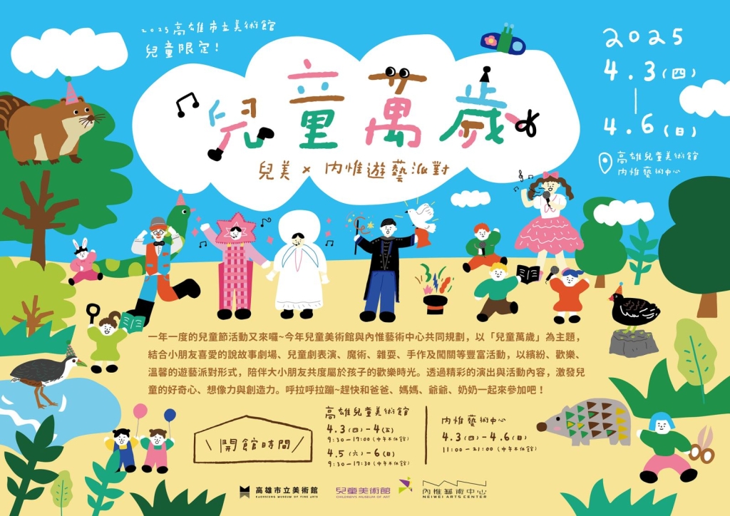 2025年兒童美術館與內惟藝術中心共同規劃,以「兒童萬歲」為主題,結合小朋友喜愛的說故事劇場、兒童劇表演、魔術、雜耍、手作及闖關等豐富活動,以繽紛、歡樂、溫馨的遊藝派對形式,陪伴大小朋友共度屬於孩子的歡樂時光。透過精彩的演出與活動內容,激發兒童的好奇心、想像力與創造力。呼拉呼拉蹦~趕快和爸爸、媽媽、爺爺、奶奶一起來參加吧!更多兒童節活動詳細內容,請至活動頁面查詢。