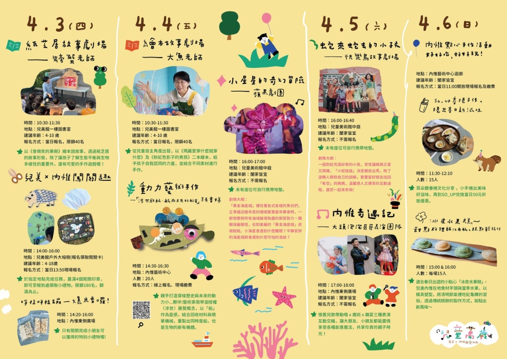 ‧ 活動關卡: 剪紙動物園(兒美)、摺紙玩空間(兒美)、藝起趣內惟(內惟)、步步惟營(內惟)