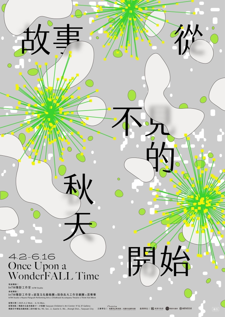 桃園市兒童美術館第三屆策展徵件獲選展「故事從『不見的秋天』開始」以「沉浸式體驗」與「物件劇場」兩種形式為主要路徑,藉由獨創的場景設計引領觀眾感受臺灣東岸四季的文化地景,亦透過故事啟發孩童與自然共舞的身體經驗;展覽現場更以大型故事書為舞台,鼓勵孩童「走入」劇場。本次為貼合桃園本地經驗,策展團隊聚焦埤塘文化的地方紋理,展出以桃園埤塘為題的三種時空,在展場打造可供參與的「埤塘共創」互動裝置。