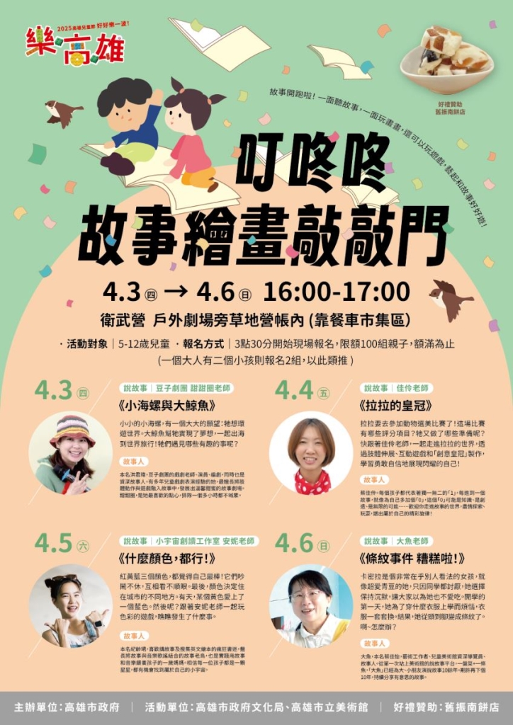 高雄市文化局策劃一系列親子閱讀與互動體驗活動,讓孩子透過故事開啟無限想像,四月三至六日每天上午十一時至下午六時,親子互動演出區將帶來豐富的節目,其中每日下午四時至五時的「叮咚咚,故事繪畫敲敲門」,特別邀請專業說故事達人,介紹不同的繪本,帶領小朋友透過趣味互動、精彩故事與創意遊戲,激發無限想像力與創造力。