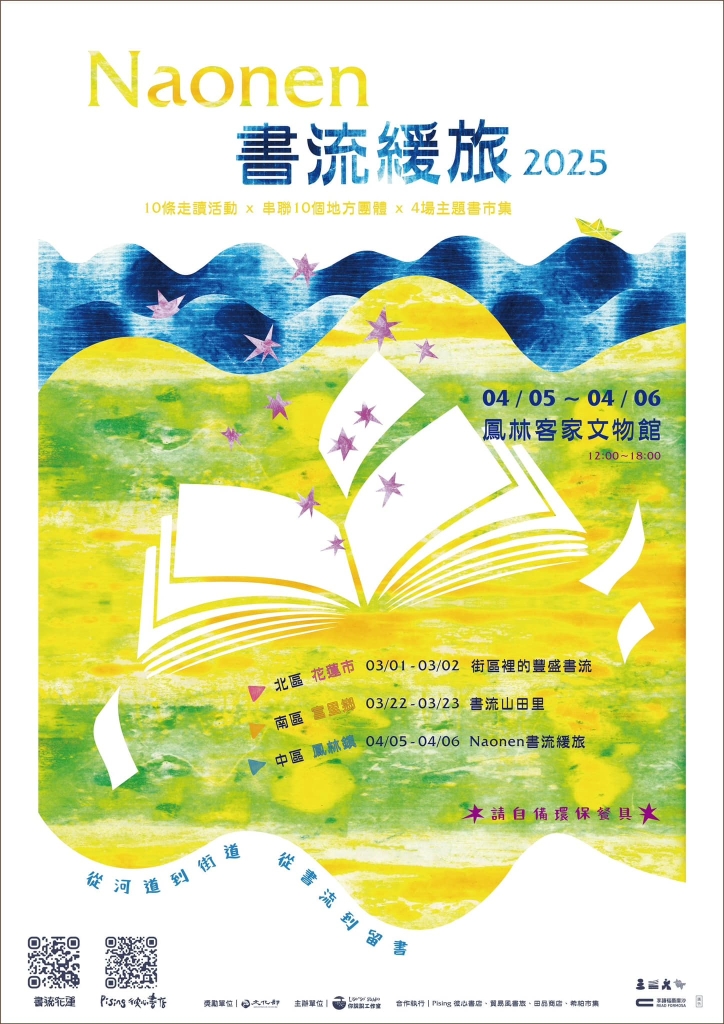 豐盛山田河海的花蓮書店們!以及臺灣島嶼紛至樂湧的各地書店、出版社、工作室,大家都來了!今年來到人文薈萃的花蓮縣鳳林鎮街區,「Naonen書流緩旅」用慢~漫~來的腳步,探訪循跡走在歷史軌跡之中的鳳林。
