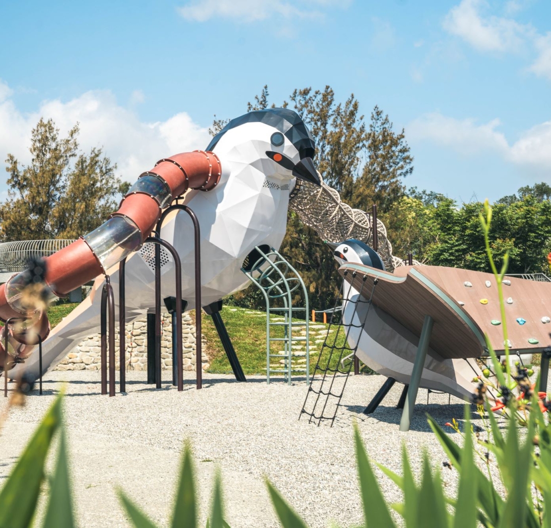 改造工程以「生態共融、環境友善」設計理念,整合園區資源,優化公共設施,展現生態保育與永續利用的平衡精神,不僅改造期間沒有移走任何一棵樹,還並新增好多新鮮有趣設計,像是台灣特有種烏頭翁造型遊戲塔,給大人運動的體健設施,林下探險路線、可翻滾的自然土丘,甚至還能在親水區玩水,生態池還重新移置復育,原生動植物又能重新快樂生活!