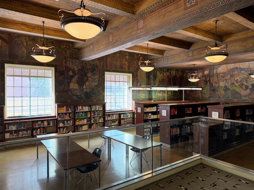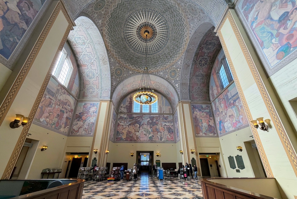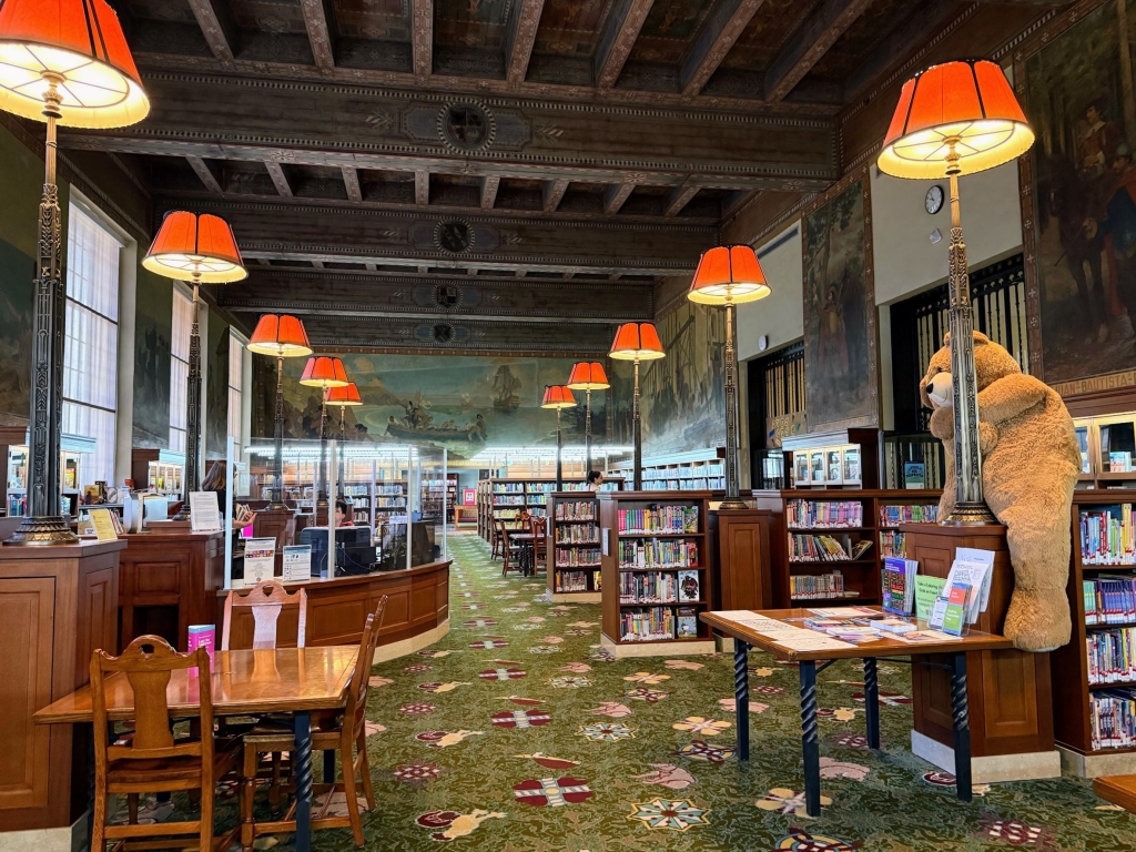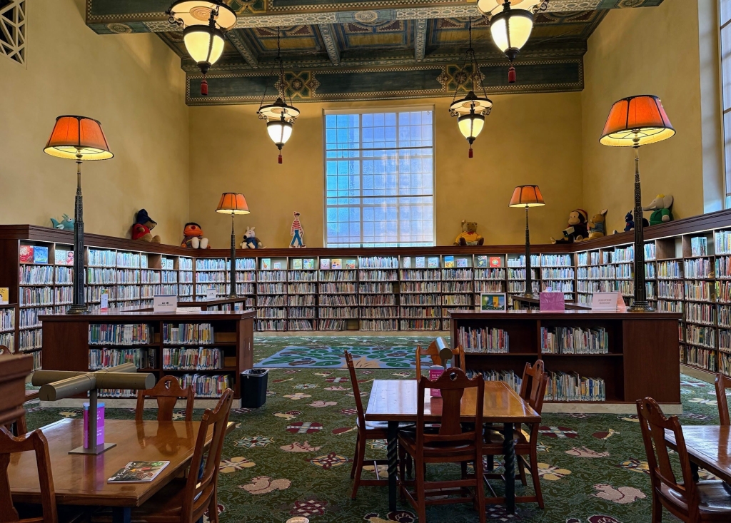 中央圖書館是流通圖書館,也是研究圖書館,因此它的童書區稱作兒童文學部門(Children’s Literature Department)。從二樓的圓頂大廳可以走進童書室,這裡原本是參考資料室,是少數仍保留1920年代樣貌的閱覽室。從地毯、牆壁到天花板,都佈滿了圖案,牆上的壁畫都是與加州早期歷史有關的畫作,深色木頭書架搭配著復古的高聳立燈,讓人覺得宛如置身城堡之中。