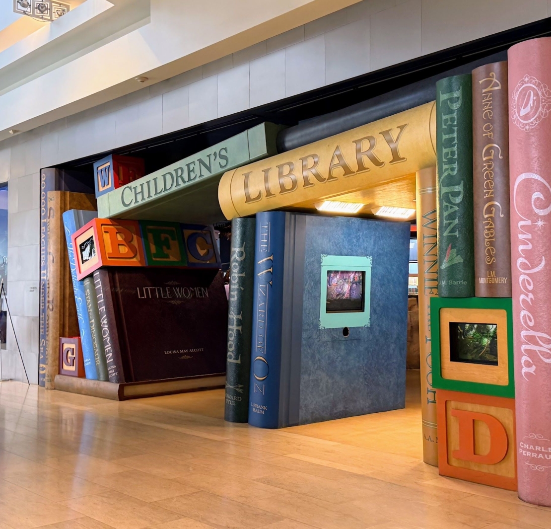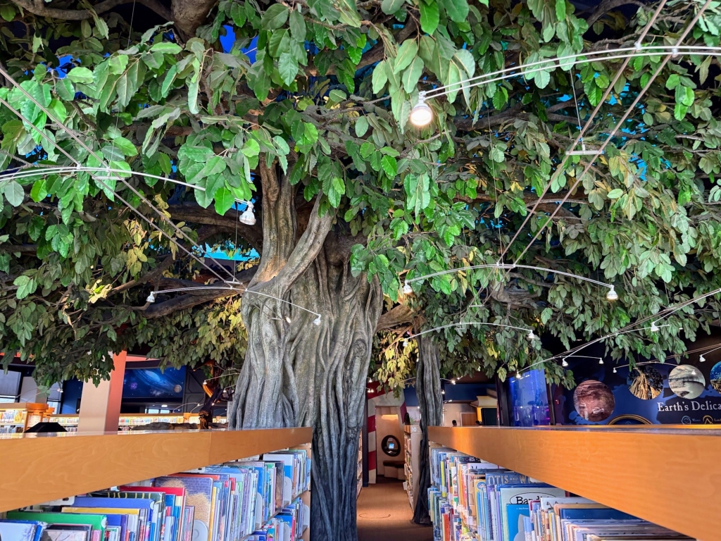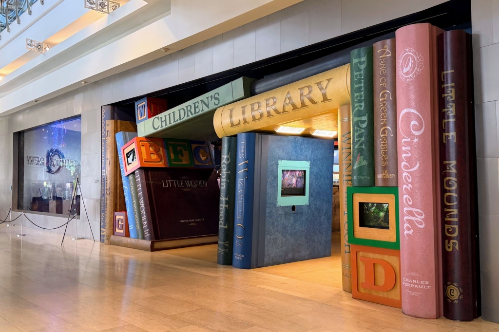 其中最引人入勝的就是兒童圖書館的入口了!入口的左邊有大型的鹹水水族箱,往往讓孩子駐足流連,而入口的造型則是由巨大的書本堆疊而成,書脊上顯示的都是經典兒童文學名著的書名,吸睛的入口邀請孩子穿過書堆,進入神奇的故事世界。這個世界裡有什麼呢?有暴龍的骨頭、太空梭、燈塔和大榕樹!