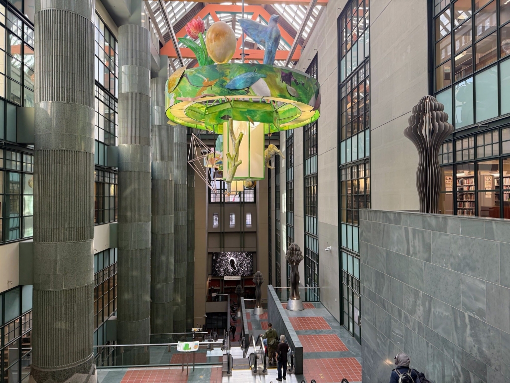 東側的新建築Tom Bradley Wing有著挑高八層樓的明亮中庭,和懸吊於空中的巨大藝術燈飾。有一半的樓層建在地底下,可以從中庭搭電扶梯一路向下。東側的一樓還躲藏著另一間保留1920年代原始樣貌的閱覽室,位於國際語言部門(International Languages Department)內的一個角落。這間閱覽室的壁畫畫的是中世紀英國的場景,出自蘇格蘭歷史小說家瓦爾特.司各特(Walter Scott)的故事《英雄艾凡赫》(Ivanhoe),這間房間才是原本的兒童圖書室,比起現在的童書區小了非常多。來參觀這間壯觀的圖書館時,不要錯過了躲藏在新建築裡的這間小閱覽室。