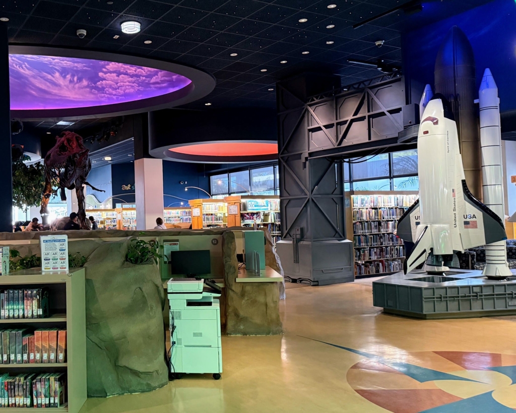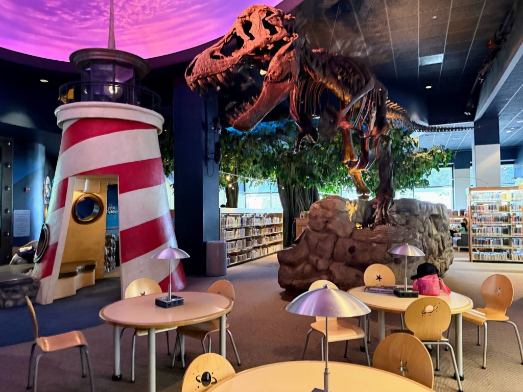 不同造型和高度的桌椅和沙發,搭配著各區的主題散佈在不同角落。暴龍骨頭的下面有一些可以操作、探索的設計,圖書館四周的牆面上也有地球科學相關的展示。暴龍上方的藍色圓頂天空,展示著不同類型的雲朵,燈塔則是一個孩子可以鑽進去躲藏的閱讀角落,處處可見為親子精心設計的小細節。除了相當吸睛且好玩的硬體設備之外,圖書館也舉辦豐富的兒童活動,像是不同年齡層的故事時間、科學活動、藝術手作教學,或是夏日閱讀挑戰、戶外觸摸小動物的活動等。