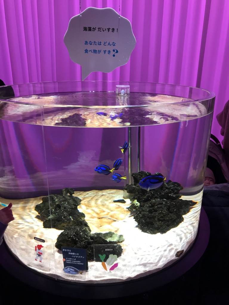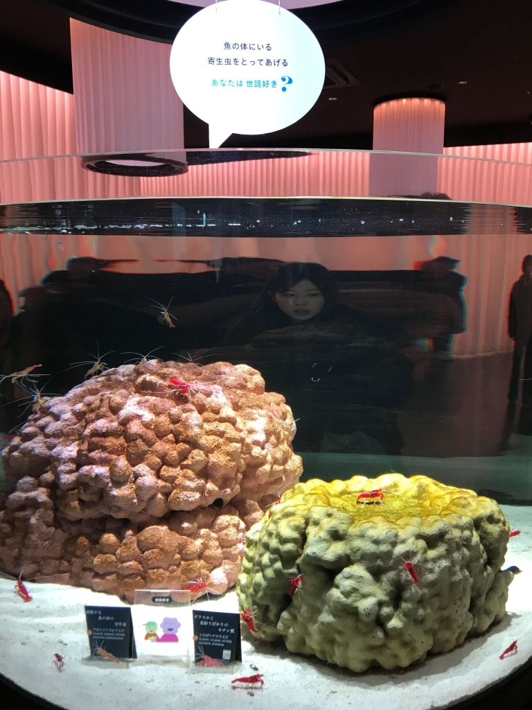 每個水缸上方都有一張吊牌,一句是簡單的黑色介紹文字,另一句則是以藍色字體提出的提問,例如:「你是不是也跟這種生物一樣,超愛______?」那一刻我才真正理解這不只是看動物,而是一場讓人重新認識自己的過程。